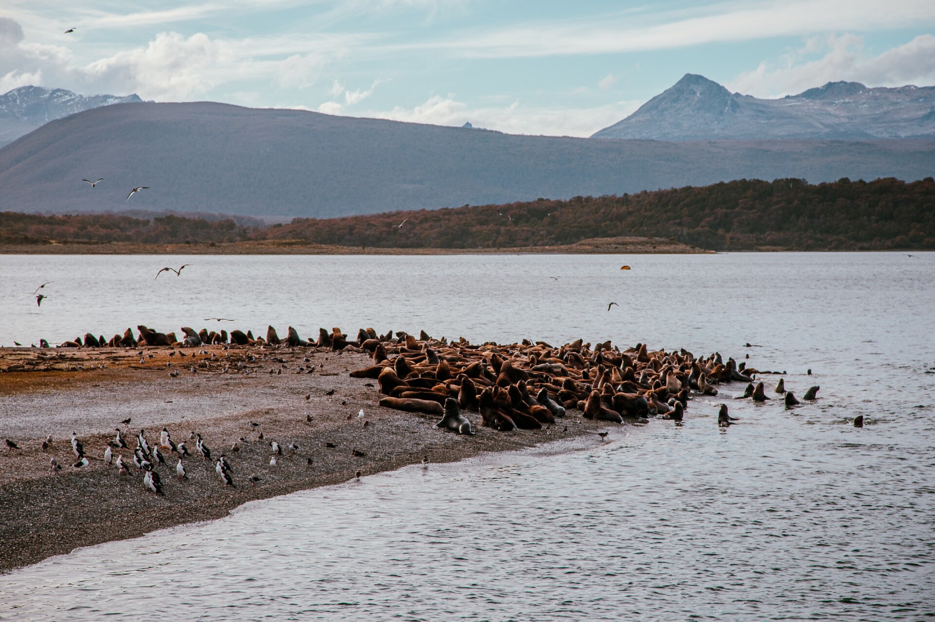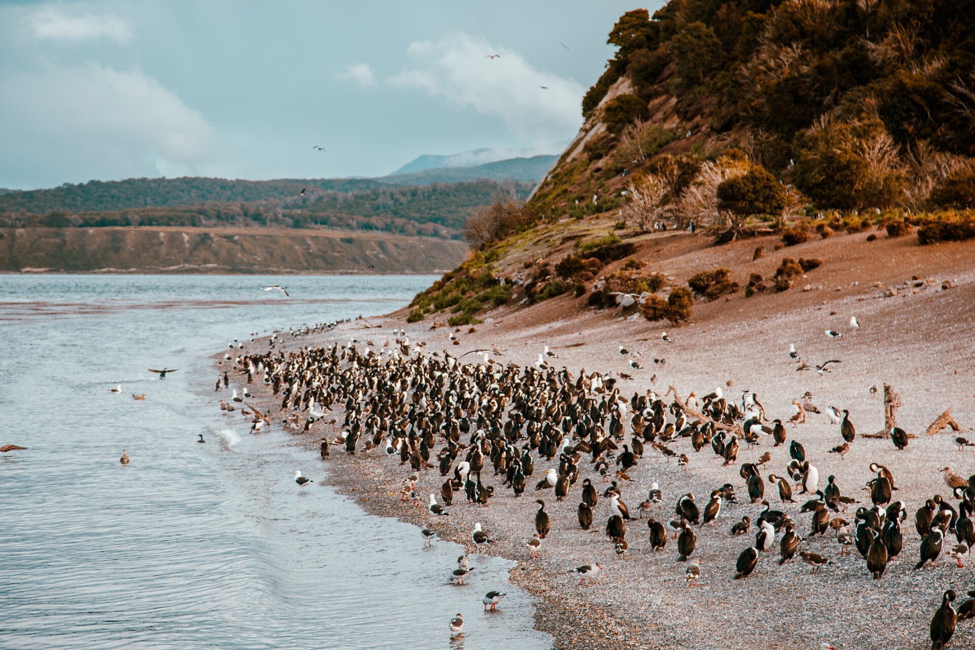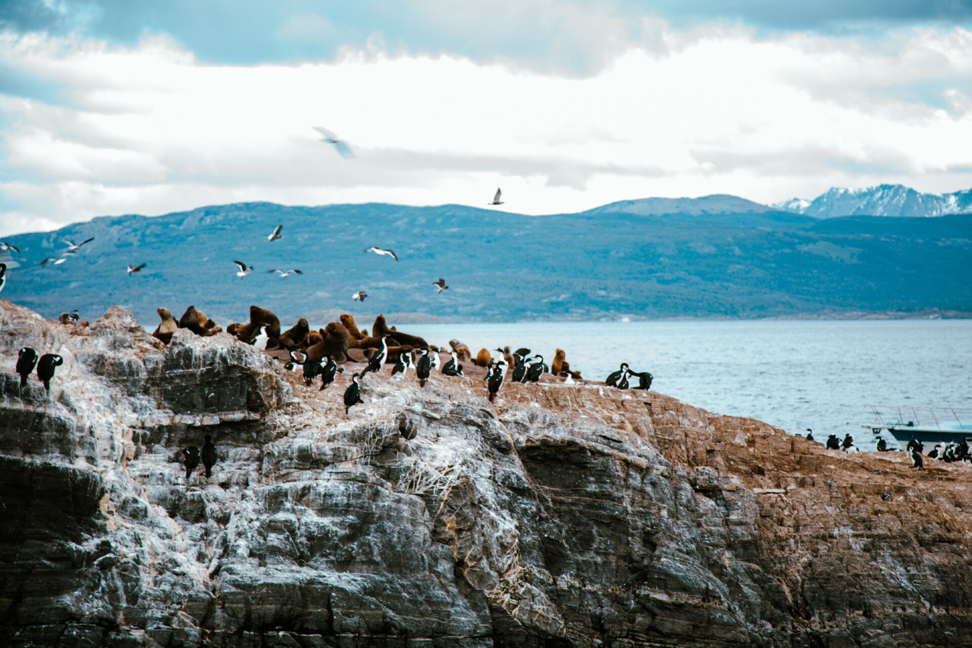 No caminho, passamos pela Ilha dos Pássaros, onde admiramos diversas aves marinhas fueguinas, tais como skuas, albatrozes, gaivotas, cauquenes e patos.
