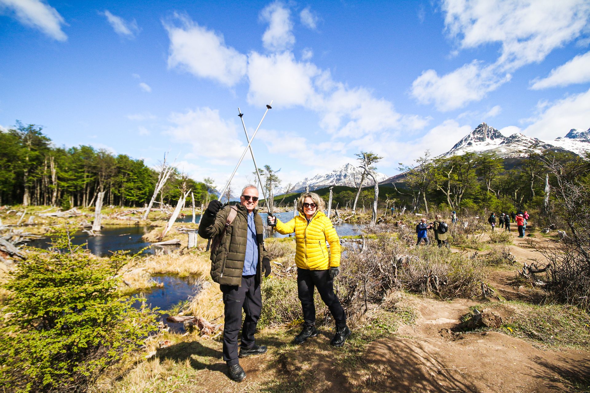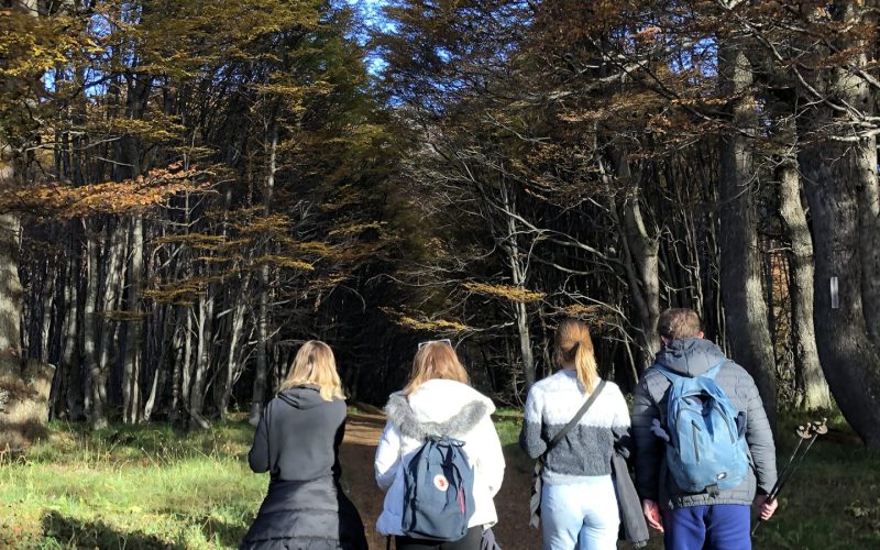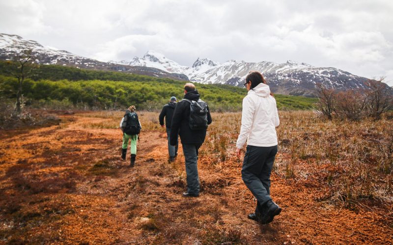 Depois de ouvirmos de nosso guia as instruções sobre nosso trekking de 4,7 km, adentramos um denso bosque de Lengas, caminhando em um solo esponjoso, conhecido como turbas. Seguimos à margem de riachos de coloração ímpar. Logo iremos nos deparar com as castoreiras – diques construídos pelos castores -, que causam grande impacto no meio ambiente. Nosso guia fará uma pausa para nos contar essa história, bem como outras características da flora e fauna da região.